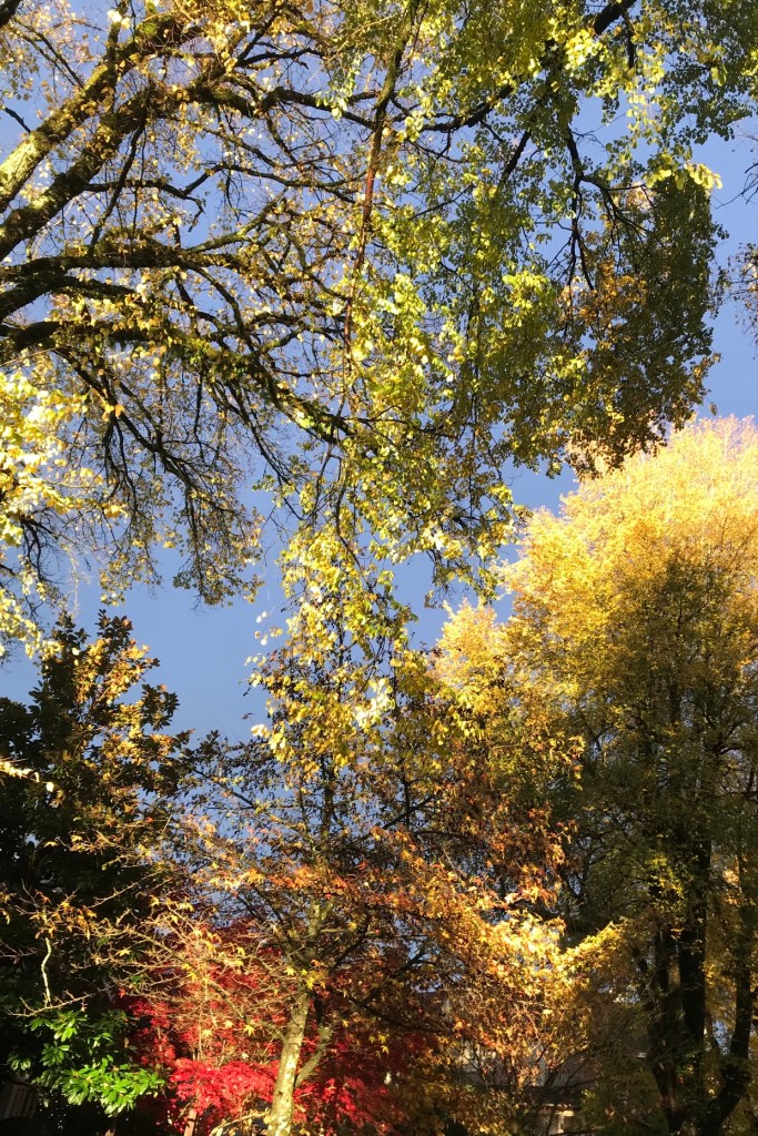 It was beautiful. A full, vivid rainbow right above us, a second one faint behind it. The last fall leaves, still brilliant, still clinging to their branches, seemed lit from within.